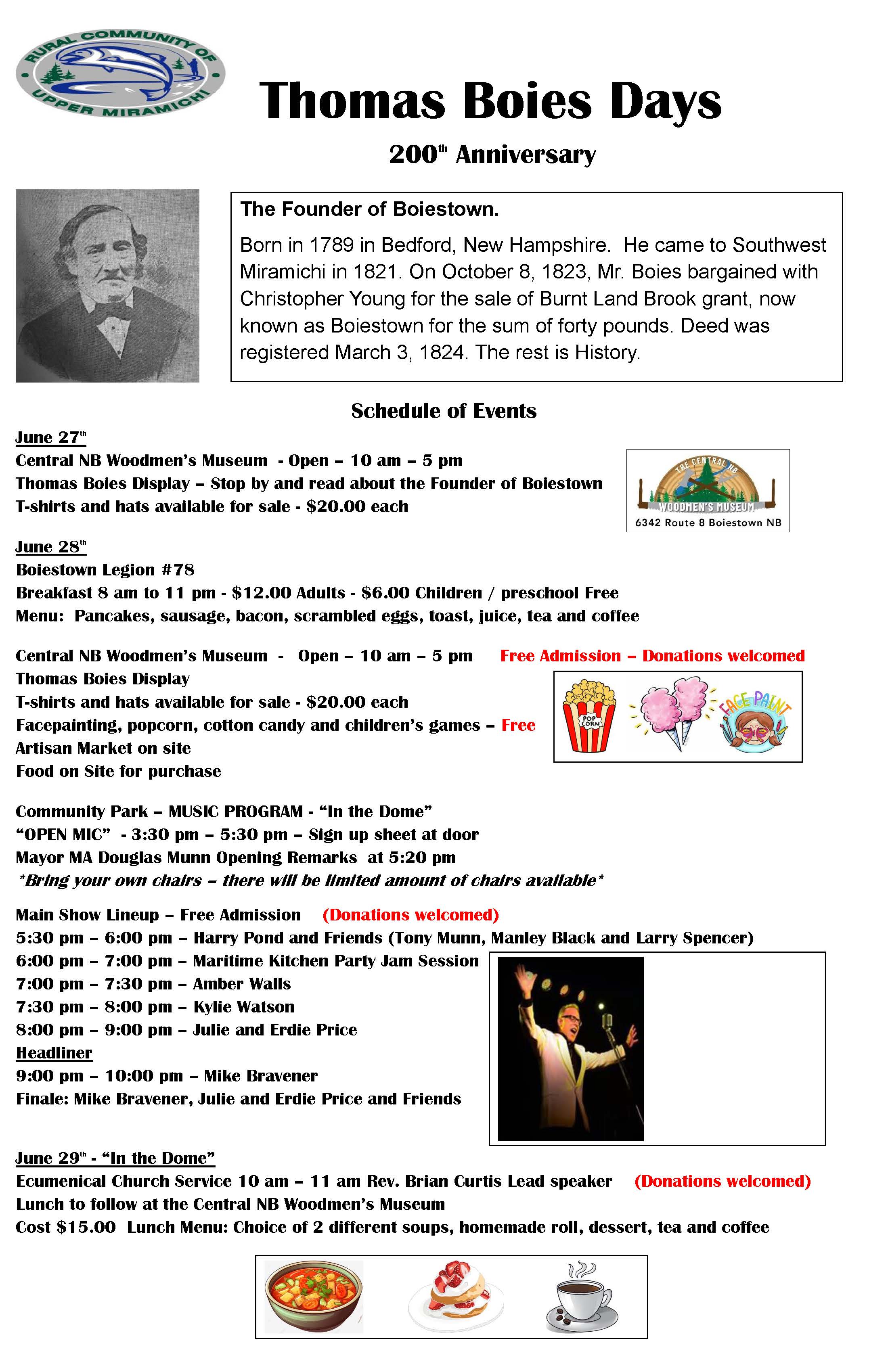 Celebrating the 200th anniversary of the great community of Boiestown NB. Join us for events, great food, markets, and entertainment for everyone.